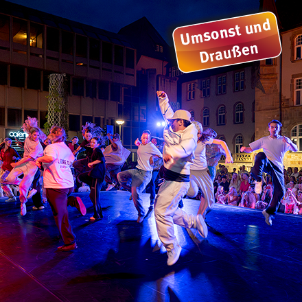 Musik und Tanz unter freiem Himmel – das Tanzfestival Open Air auf dem Rathausplatz bietet Spaß und Bewegung für alle. Zur Halbzeit des Tanzfestivals präsentieren die Workshop-Teilnehme:innen der ersten Woche die Ergebnisse ihres Tanztrainings und laden zum Mitmachen ein. Auf der Open-Air-Bühne bietet sich für die Tänzer:innen die Gelegenheit, ihr neu erlerntes Können vorzustellen. Dabei werden Energien freigesetzt, die das gesamte Publikum mitreißen.